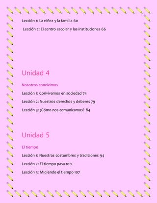 Este documento presenta un plan de estudios dividido en 6 unidades que cubren temas sobre el medio ambiente natural, la sociedad, la comunicación, las costumbres, el paso del tiempo y la historia. La primera unidad se enfoca en el medio ambiente que nos rodea y contiene 4 lecciones. Las unidades siguientes tratan sobre las personas y la sociedad, los derechos y deberes, las tradiciones, la medición del tiempo y el pasado de la comunidad y el país.