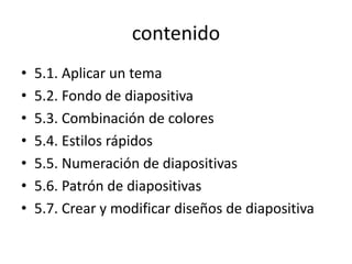 Este documento proporciona instrucciones sobre cómo aplicar temas, fondos, combinaciones de colores, estilos rápidos, numeración de diapositivas, patrones de diapositivas y crear diseños personalizados en PowerPoint. Explica cómo aplicar temas existentes o crear presentaciones basadas en temas, personalizar fondos y colores, usar estilos rápidos para formato rápido, agregar numeración a diapositivas, entender patrones de diapositivas y crear nuevos diseños.