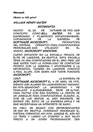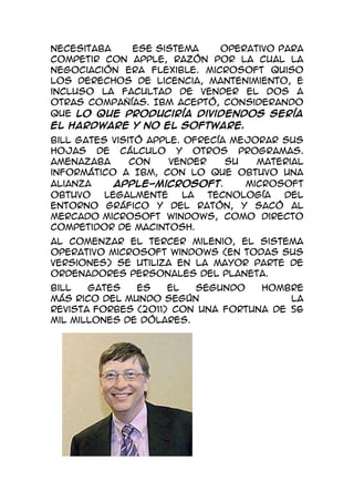 Bill Gates (1955) es un empresario y filántropo estadounidense que cofundó Microsoft en 1975. Microsoft creó el sistema operativo Windows, el más utilizado en todo el mundo. Gates dejó la universidad para dedicarse a Microsoft y negoció acuerdos exitosos con IBM y Apple que ayudaron a Microsoft a dominar el mercado de software. Actualmente Gates es la segunda persona más rica del mundo según Forbes.