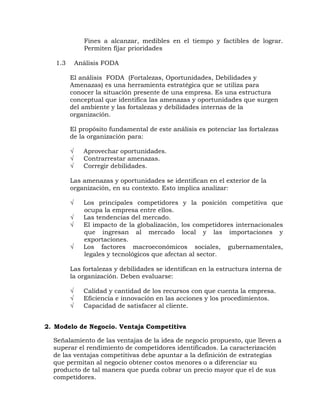 El documento detalla la creación de un plan de negocios, incluyendo un análisis FODA, diseño de modelo de negocio y evaluación del mercado, con el objetivo de facilitar la toma de decisiones sobre iniciativas empresariales. Además, aborda la planificación financiera y la identificación de factores de riesgo y su impacto en el éxito del negocio. Por último, se enfoca en el desarrollo futuro, estableciendo metas a mediano y largo plazo para la iniciativa o proyecto propuesto.
