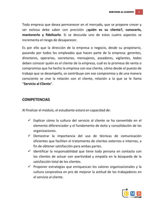 Este documento presenta una introducción al concepto de servicio al cliente. Explica que 1) el cliente es el activo más valioso de una organización y que conocerlo es fundamental, 2) define la diferencia entre atención al cliente y servicio al cliente, y 3) describe los fundamentos del servicio al cliente incluyendo el triángulo del servicio y los momentos de verdad. El documento concluye explicando la estructura temática de un módulo sobre servicio al cliente.