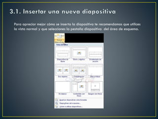Este documento explica cómo insertar, seleccionar, copiar, duplicar, mover y eliminar diapositivas en una presentación de PowerPoint. Se detallan los pasos para realizar cada acción como insertar una nueva diapositiva, seleccionar varias diapositivas consecutivas manteniendo presionada la tecla Mayús, copiar una diapositiva a otra presentación o duplicarla en la misma presentación, y eliminar diapositivas seleccionadas usando el menú contextual o la tecla Supr. El documento recomienda practicar estas operaciones