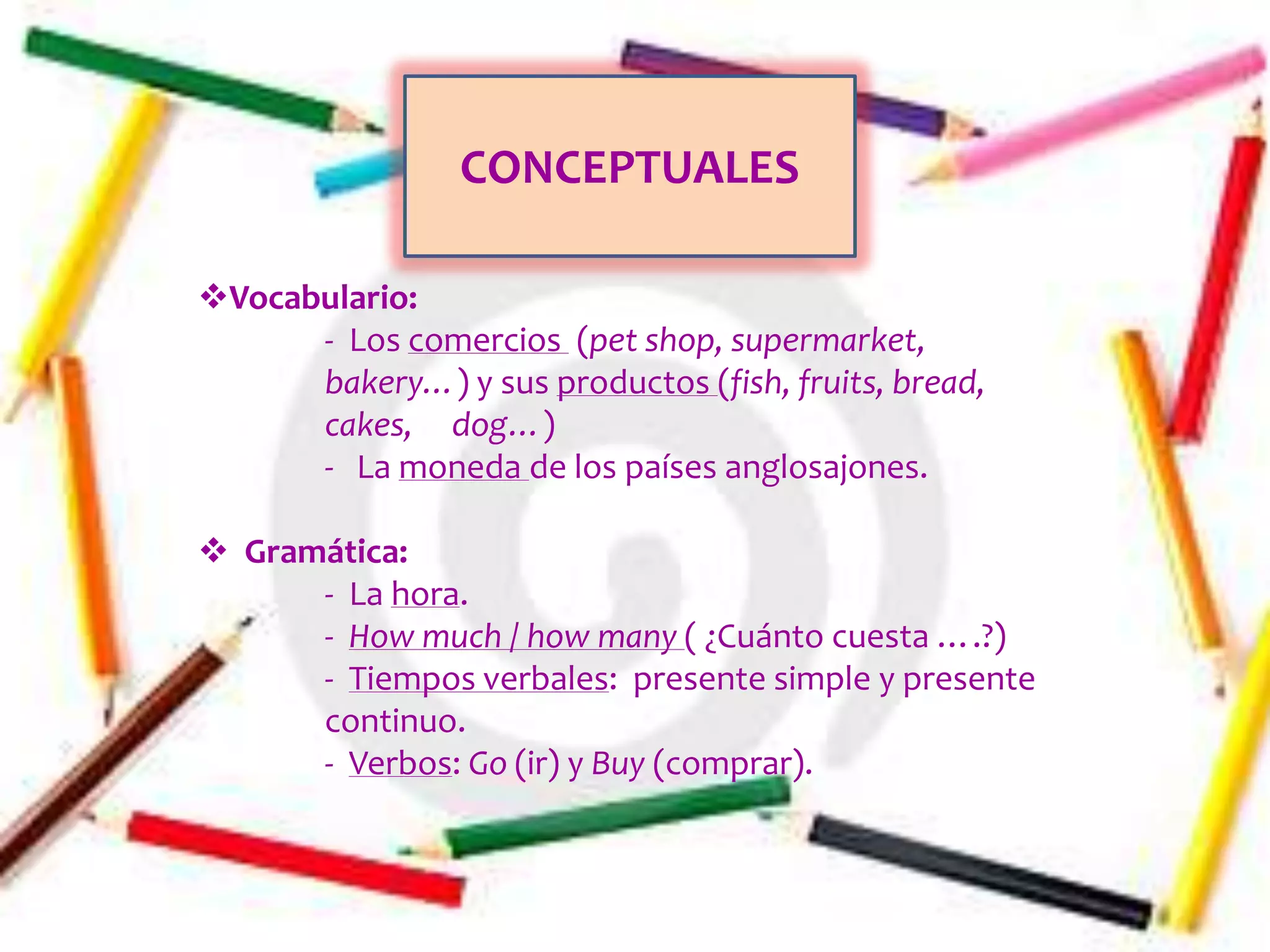 Este documento describe objetivos de aprendizaje de inglés para estudiantes. Incluye objetivos conceptuales relacionados con vocabulario básico como tiendas, productos y moneda, así como gramática como la hora, cantidades y tiempos verbales. También incluye objetivos procedimentales como identificar objetos, comprender audio, ordenar palabras y aprender canciones. Finalmente, incluye objetivos actitudinales como respeto, aprecio por la cultura inglesa y desarrollo de la creatividad.