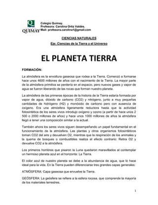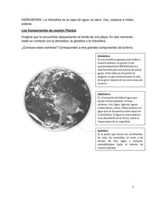 El documento describe los componentes principales de la Tierra: la atmósfera, geósfera e hidrósfera. La atmósfera se formó hace 4600 millones de años y originalmente contenía vapor de agua, dióxido de carbono y nitrógeno. La geósfera está compuesta por la corteza terrestre, el manto y el núcleo. La hidrósfera incluye todos los océanos, ríos y lagos en la Tierra. Las placas tectónicas se mueven constantemente, causando terrem