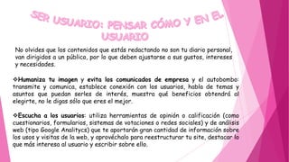 El documento ofrece consejos para crear contenidos de calidad en la web que sean atractivos y útiles para los usuarios. Recomienda humanizar la comunicación, escuchar a los usuarios, ofrecer contenidos originales y de calidad, crear textos legibles y fáciles de entender cuidando la ortografía y estructura, e ilustrarlos con imágenes apropiadas. También aconseja actualizar frecuentemente los contenidos y eliminar lo desfasado.