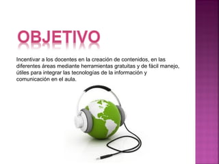 El documento habla sobre la importancia de incentivar a los docentes a crear contenidos educativos utilizando herramientas gratuitas y de fácil uso para integrar tecnologías en el aula. También discute los principios básicos de diseño de contenidos como estructura, tipografía, imágenes, multimedia y redacción para crear materiales efectivos.