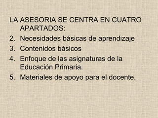 El documento resume los principales objetivos y contenidos de la educación primaria. Cubre las necesidades básicas de aprendizaje, los contenidos fundamentales, el enfoque de las asignaturas, y los materiales de apoyo para los maestros. Los contenidos básicos incluyen habilidades como la lectura, escritura y resolución de problemas, así como conocimientos teóricos, valores y actitudes. El documento enfatiza el desarrollo de la comunicación, la selección de información, la resolución de problemas y la formación ética en