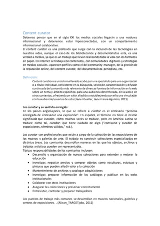El documento define el rol de content curator y explica que implica la búsqueda, selección, caracterización y difusión de contenido relevante sobre un tema específico para una audiencia determinada. También discute las habilidades necesarias para este rol, incluyendo conocimientos de tecnología, comunicación, y el tema específico. El content curator aporta valor al filtrar y dar contexto a la gran cantidad de información disponible online.
