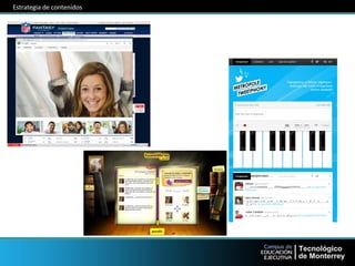 El documento presenta una estrategia de contenidos para redes sociales que incluye aspectos como la escucha activa, el storytelling y el uso eficaz de palabras clave para conectar con el consumidor. Se enfatiza la importancia de gestionar la percepción de autenticidad y de crear contenido útil y atractivo que fomente la viralidad. Además, se sugieren herramientas y tácticas para optimizar la comunicación y construir una marca personal influyente en el entorno digital.