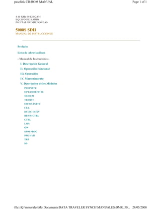 Este manual describe un equipo de radio digital de microondas de 4-11 GHz con capacidad 64/128 QAM. El manual contiene secciones sobre la descripción general del equipo, su operación funcional, operación, mantenimiento y descripción de los módulos internos como el modem, controladores de tráfico, interfaces y otros componentes electrónicos.