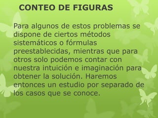 El documento presenta métodos para contar figuras geométricas. Explica el método combinatorio para contar triángulos en una figura mediante la asignación de números a sus partes. También presenta fórmulas para contar segmentos, triángulos, cuadriláteros, cuadrados, cubos y paralelepípedos dependiendo del número de espacios o casilleros de la figura.