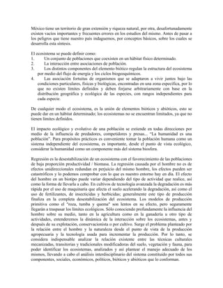 El documento describe los ecosistemas de México y los factores que afectan su equilibrio. Brevemente, explica que 1) los ecosistemas son complejos y están formados por elementos bióticos y abióticos, 2) las actividades humanas como la agricultura y ganadería han causado degradación a través de la tala, sobrepastoreo y uso de maquinaria pesada, y 3) es necesario desarrollar planes para el aprovechamiento sostenible de los recursos naturales y proteger los ecosistemas.