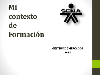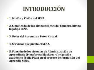 Este documento presenta la introducción a un curso de gestión de mercados del SENA. Explica la misión y visión del SENA, los símbolos de la institución, los roles del aprendiz y tutor virtual, los servicios que ofrece el SENA como la formación titulada y complementaria, y las funciones de los sistemas de administración de aprendizaje Blackboard y Sofia Plus.