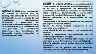 El SENA tiene la misión de invertir en el desarrollo social y técnico de los trabajadores colombianos a través de la formación profesional integral. Su visión es convertirse en una entidad de clase mundial en formación profesional para 2020, contribuyendo a la competitividad de Colombia mediante la productividad de las empresas, la generación de empleo, y el desarrollo de fuerza laboral innovadora. El SENA usa la plataforma Blackboard para gestionar la formación presencial y en línea, y el sistema Sofía Plus para
