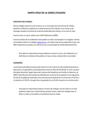 Santa Cruz de la Zarza es un municipio de la provincia de Toledo con 4.891 habitantes. Su economía se basa tradicionalmente en la agricultura y la ganadería, aunque ahora también es importante la industria y los servicios. Cuenta con un colegio público de educación infantil y primaria, así como un instituto de educación secundaria obligatoria. Está comunicado por carretera y ferrocarril con otras ciudades cercanas.