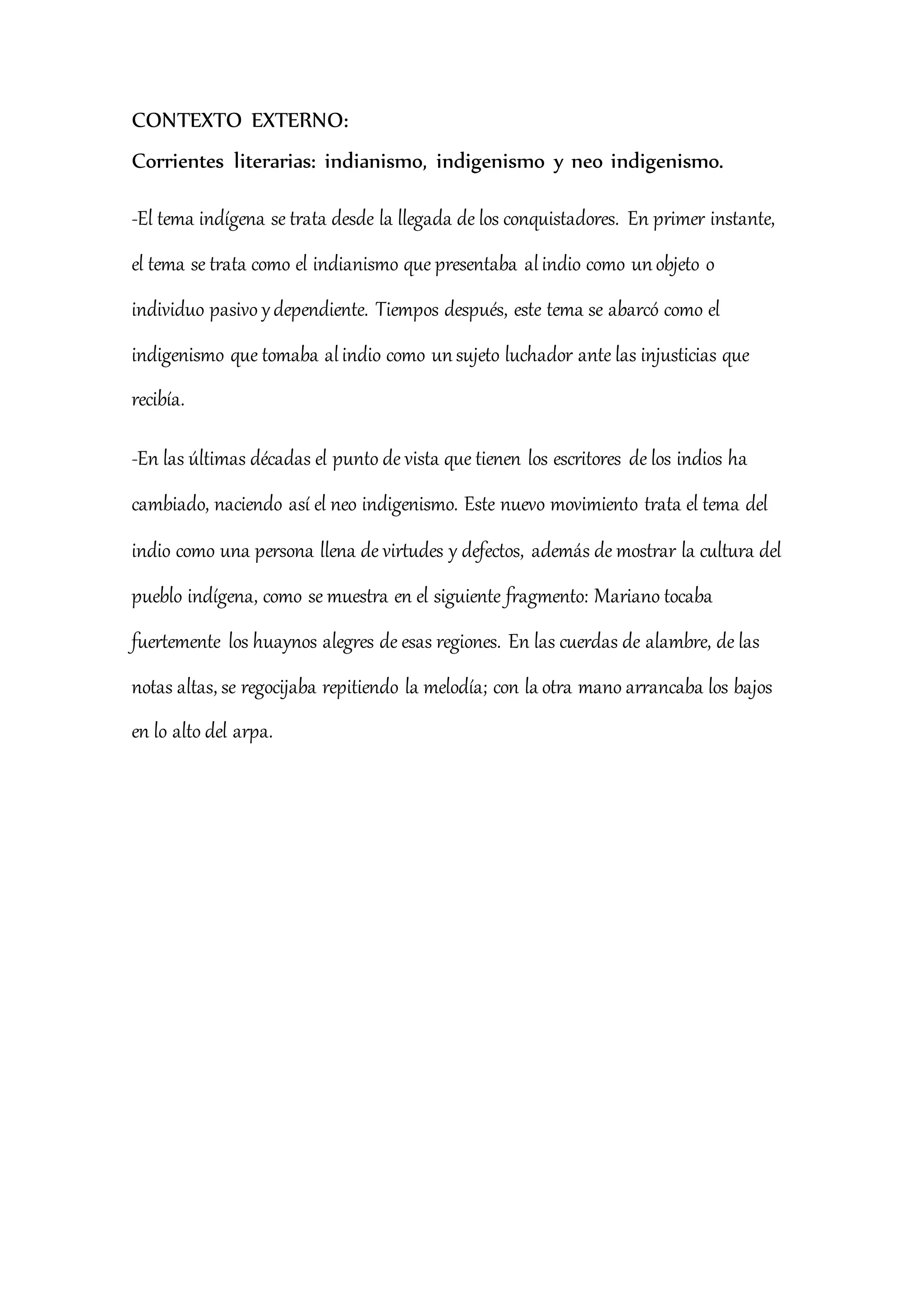 El documento describe tres corrientes literarias relacionadas con el tema indígena en América Latina: el indianismo, el indigenismo y el neoindigenismo. El indianismo presentaba al indio como un objeto pasivo. El indigenismo lo consideraba un sujeto que lucha contra la injusticia. El neoindigenismo, surgido en las últimas décadas, muestra al indio como una persona compleja y presenta aspectos de su cultura, como se ilustra en un fragmento sobre un hombre tocando música tradicional en el arpa.