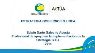La estrategia Gobierno en Línea (GEL) hace parte del plan Vive Digital del gobierno colombiano, cuyo objetivo es modernizar al estado para proveer servicios más eficientes, transparentes y participativos a ciudadanos y empresas. GEL ha evolucionado desde 2000 para ampliar su alcance a más entidades gubernamentales y mejorar su implementación, actualmente definida por el Decreto 2693 de 2013.