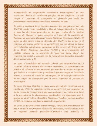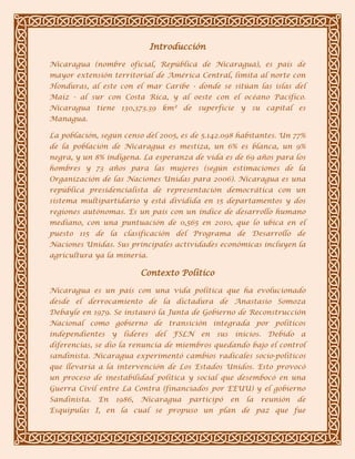 Nicaragua es una república presidencialista ubicada en América Central con una población de más de 5 millones de habitantes. Ha experimentado un tumultuoso desarrollo político desde el derrocamiento de la dictadura Somoza en 1979, incluyendo una guerra civil entre los sandinistas y la contra en la década de 1980. Desde las primeras elecciones democráticas en 1984, el país ha tenido elecciones periódicas aunque polarizadas y con acusaciones de irregularidades, alternando entre gobiernos de izquierda sandinista y de