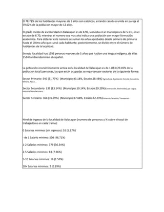 Xalacapan se encuentra en el estado de Puebla, México a una altitud de 1620 metros sobre el nivel del mar. Tiene una población de 4161 personas, de los cuales 2998 viven en hogares indígenas y 1637 hablan un idioma indígena. La estructura económica se basa principalmente en el sector primario como la agricultura y la ganadería, aunque también existen sectores secundario y terciario. La mayoría de los habitantes tienen acceso a servicios básicos como electricidad y agua potable, pero algun