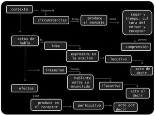 Este documento presenta conceptos clave sobre la comunicación, incluyendo el contexto y los actos de habla, hechos y opiniones, modalizaciones discursivas, comunicación verbal y no verbal, y elementos paraverbales. Explica cómo el contexto, la intención del hablante y la relación entre participantes afectan el significado del mensaje. También distingue entre hechos, que pueden ser verificados, y opiniones, que reflejan las creencias del autor.