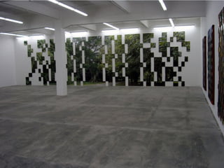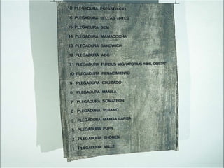 El documento lista obras de arte de varios artistas venezolanos como Félix Suazo, Alfred Wenemoser, Argelia Bravo Rosado, Héctor Fuenmayor, Javier Téllez, José Antonio Hernández-Diez, Juan Carlos Rodríguez y Juan José Olavarría. Incluye el título, el año, los materiales y en algunos casos la colección o exposición de cada obra.