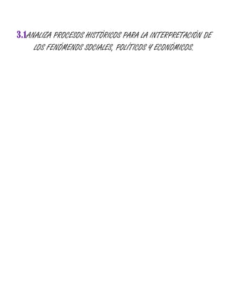 El documento habla sobre analizar procesos históricos para interpretar fenómenos sociales, políticos y económicos. Se menciona que la unidad 3 se enfoca en examinar cómo los eventos del pasado ayudan a explicar situaciones actuales en la sociedad, gobierno e industria.