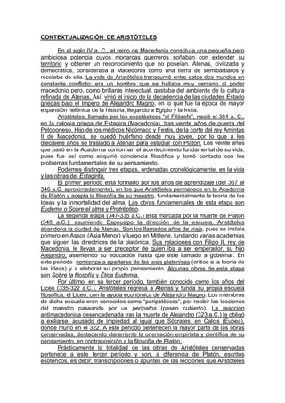 1) Aristóteles nació en el siglo IV a.C. en Macedonia y estudió con Platón en Atenas durante 20 años, adoptando inicialmente su filosofía.