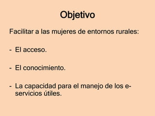 El documento describe un proyecto para facilitar a las mujeres en entornos rurales el acceso y conocimiento de los servicios en línea a través de la elaboración de guías sobre el uso de la tecnología y Internet y sus aplicaciones en diferentes ámbitos como el empleo, la salud y la participación social.