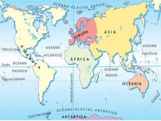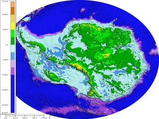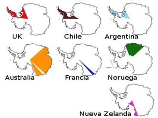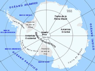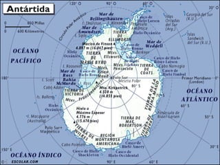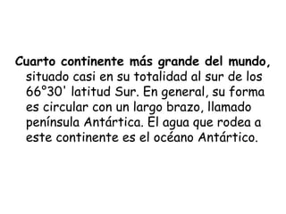 La Antártida es el cuarto continente más grande, con una superficie de 13.209.000 km² y un clima extremadamente frío, destacando como el lugar más gélido del planeta. Su biodiversidad es limitada, con pocas plantas y una fauna que incluye diversas especies marinas y el pingüino como habitante emblemático. Además, está sujeta a un tratado internacional que regula su uso y conservación, impidiendo actividades mineras y promoviendo la investigación científica.