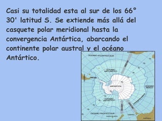 El documento describe el continente antártico. Se encuentra casi en su totalidad al sur de los 66° 30' de latitud sur y está cubierto en más del 95% por hielo. Tiene un clima extremadamente frío, seco y ventoso. La fauna incluye pingüinos, focas, ballenas y la flora se limita a musgos y líquenes. El continente está deshabitado excepto por investigadores científicos. Existen reclamaciones territoriales de siete países aunque está regulado por el Tratado Antártico de 1959 para fines pací