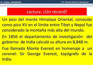 El documento describe que el pico más alto del mundo, conocido originalmente como Pico XV, fue renombrado Monte Everest en honor a Sir George Everest. El Monte Everest se encuentra situado en el límite entre el Tíbet y Nepal y tiene una altura de 8,848 metros.