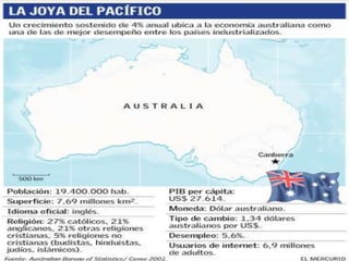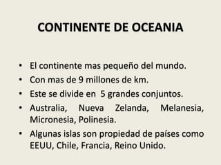 Oceanía es el continente más pequeño del mundo, compuesto principalmente por Australia y miles de islas dispersas en el Pacífico. La mayor parte de su territorio se concentra en Australia, pero también incluye países como Nueva Zelanda, Melanesia, Micronesia y Polinesia. La economía de la región depende en gran medida del turismo, la agricultura y la ganadería.