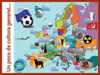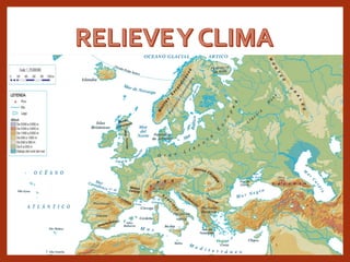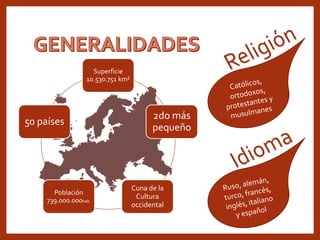 Este documento proporciona información sobre las diferentes regiones de Europa, incluyendo sus características geográficas, económicas, demográficas y formas de gobierno. Describe las subdivisiones de Europa como Europa del Norte, Central, Sur, Occidental y Oriental, y ofrece detalles sobre el clima, relieve, población, idiomas, economía y situación política de cada región.