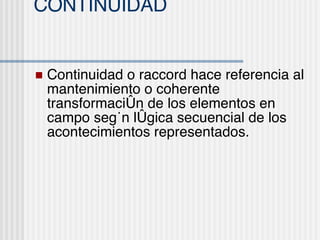 La continuidad en el lenguaje audiovisual se refiere al mantenimiento coherente de los elementos en el encuadre a lo largo de una secuencia de planos para preservar la unidad del relato. Esto incluye mantener la dirección de los movimientos y la posición relativa de las figuras en la pantalla al cambiar de ángulo. La "línea imaginaria" une las miradas o direcciones de movimiento para no cruzarla al cambiar de campo y conservar la coherencia espacial. Existen técnicas para romper esta línea de