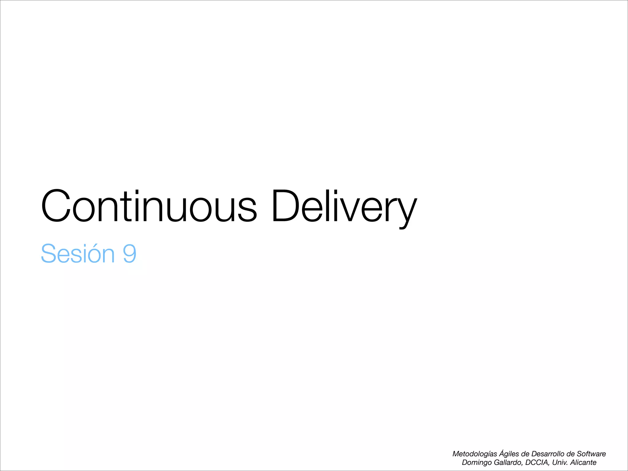 Este documento describe los conceptos y prácticas del Continuous Delivery. Explica que el Continuous Delivery busca entregas de software frecuentes, baratas, rápidas y predecibles mediante la automatización del proceso de desarrollo e implementación. También describe técnicas como las tuberías de despliegue, las ramas cortas en Git, los pequeños cambios incrementales, y el uso de interruptores de características para introducir grandes cambios de forma gradual.