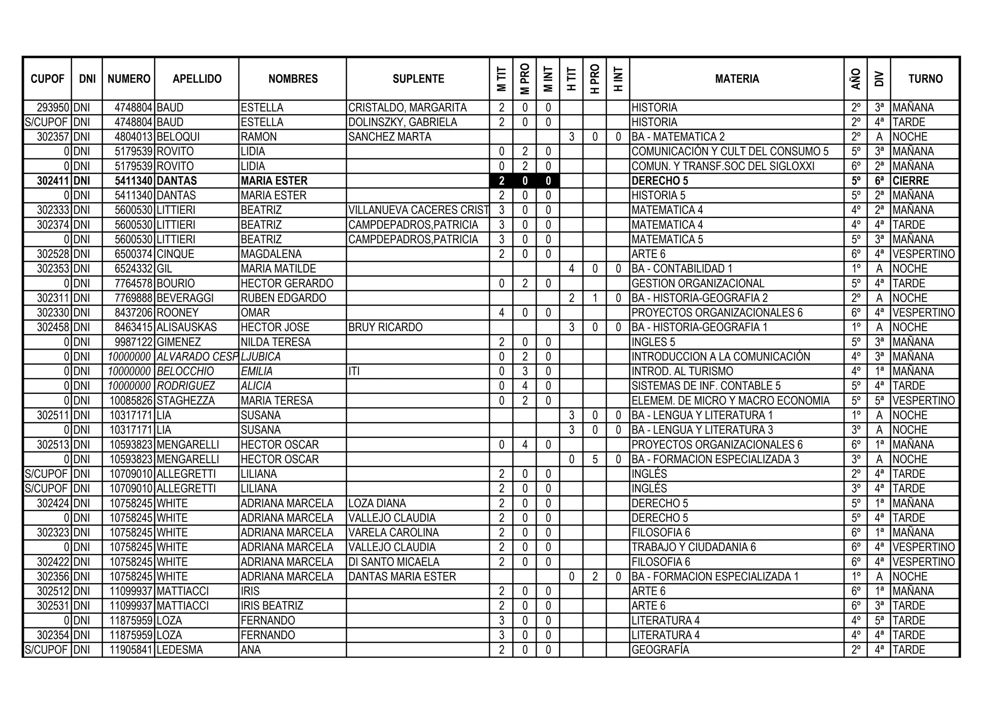 Este documento parece ser una lista de inscripciones de estudiantes a diferentes materias. Contiene el número de documento, apellido y nombre de los estudiantes, así como detalles sobre las materias a las que están inscritos como el año, división y turno. La lista incluye más de 100 registros con esta información de manera estructurada en filas y columnas.