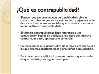 Este documento describe la contrapublicidad y ofrece algunos ejemplos. La contrapublicidad pretende hacer reflexionar sobre las campañas comerciales mediante la creación de anuncios con un objetivo contrario. El documento explica cómo se puede crear contrapublicidad modificando anuncios existentes o diseñando nuevas campañas críticas, y muestra ejemplos de trabajos de estudiantes que critican temas como la moda, la belleza y los estereotipos.