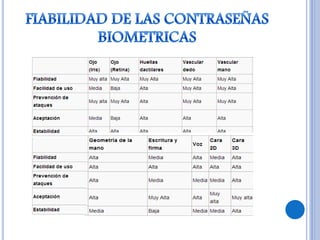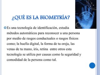 La biometría ofrece una forma más segura y cómoda de identificación que las contraseñas u otros métodos tradicionales al utilizar rasgos únicos del cuerpo. Algunas técnicas biométricas comunes incluyen el reconocimiento de huellas dactilares, iris y voz. Sin embargo, también existen preocupaciones sobre la privacidad y la posibilidad de falsificar algunas biometrías. En general, la biometría promete una autenticación más confiable que otras opciones siempre que se implemente correctamente.