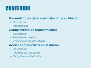 La contrastación y validación busca encontrar divergencias entre los requerimientos de diseño y las propuestas de diseño, y validar o rechazar el nuevo producto. Incluye la verificación del cumplimiento de requerimientos a través de pruebas a prototipos, la realización de acciones correctivas basadas en informes, y el cuidado de evitar el orgullo del diseñador para asegurar objetividad.