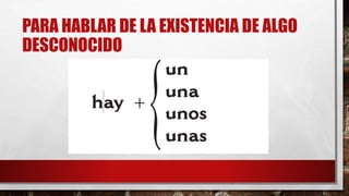Este documento habla sobre cómo hablar de cosas desconocidas y cómo localizar cosas conocidas. Ofrece un ejemplo de esto.