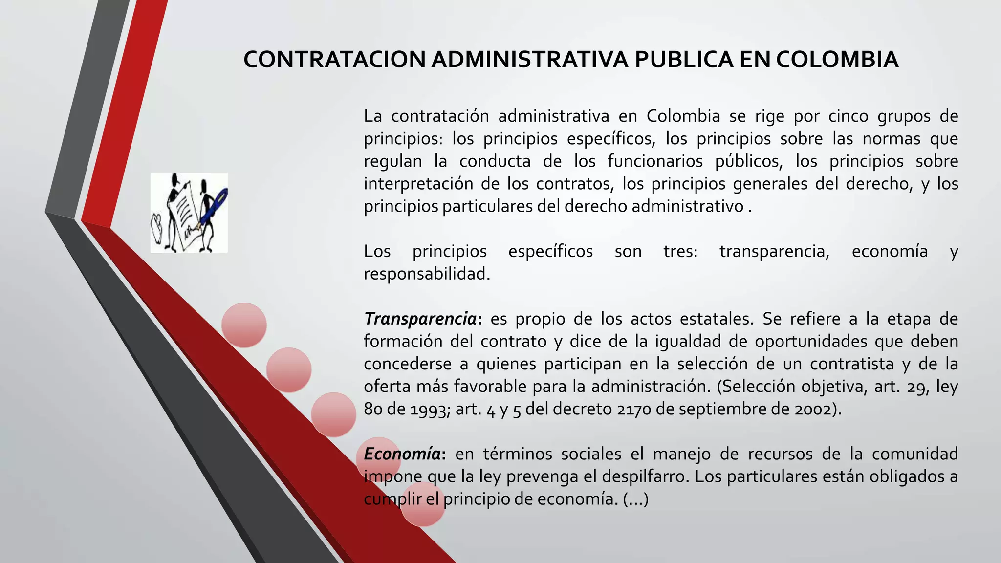 El documento habla sobre los principios que rigen la contratación administrativa en Colombia. Estos principios son: transparencia, economía y responsabilidad. La transparencia se refiere a la igualdad de oportunidades para los participantes y la oferta más favorable para la administración. La economía busca evitar el despilfarro de recursos. Y la responsabilidad es el vínculo ético entre las partes involucradas en el contrato.