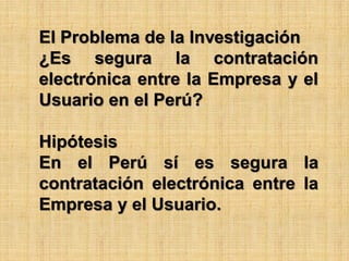 Este documento analiza la seguridad de los contratos electrónicos entre empresas y usuarios en Perú. Presenta una hipótesis de que los contratos electrónicos son seguros en Perú y define variables dependientes e independientes. Tiene como objetivo general demostrar que los contratos electrónicos tienen más ventajas que desventajas para los usuarios y como objetivo específico demostrar que no afectan el derecho a la intimidad. Explica conceptos clave como contratos electrónicos, su perfeccionamiento y la importancia del acuse de recibo electrónico.