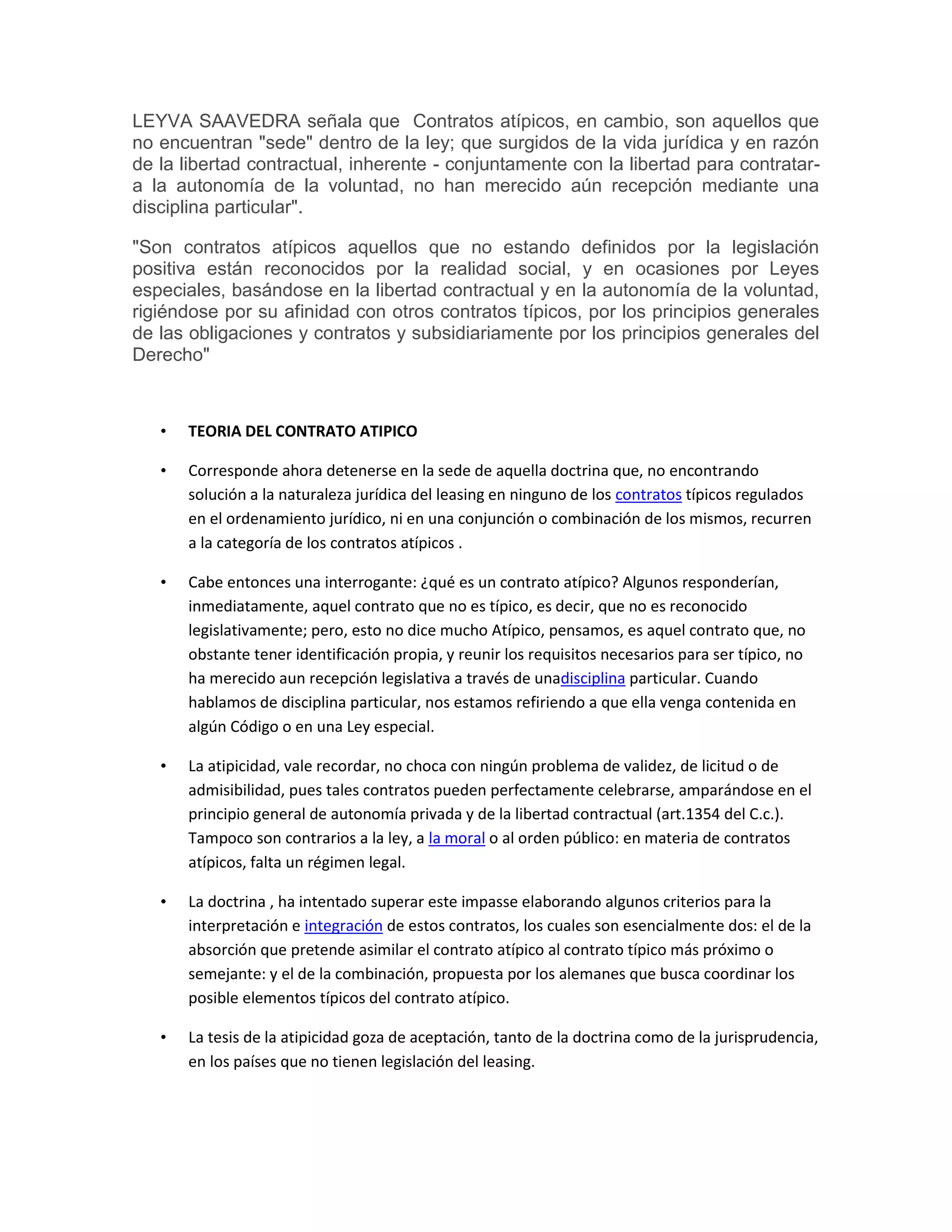 El documento discute los contratos atípicos, los cuales no están definidos por la legislación positiva pero son reconocidos por la realidad social y a veces por leyes especiales. Explica que un contrato atípico es aquel que tiene su propia identidad y reúne los requisitos para ser típico pero aún no ha recibido una disciplina particular en los códigos o leyes. También analiza la teoría del contrato atípico y cómo se ha intentado superar la falta de un régimen legal para estos contratos a través de criterios de absorción
