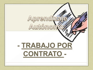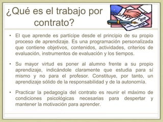Este documento describe el trabajo por contrato, un recurso pedagógico que pone al alumno en el centro de su propio aprendizaje. Explica que existen diferentes tipos de contratos como el didáctico, de éxito o resolución de conflictos. Asimismo, detalla elementos clave de los contratos como las tareas, materiales, corrección y evaluación. Finalmente, resalta que este método promueve el aprendizaje autónomo y responsable del estudiante.