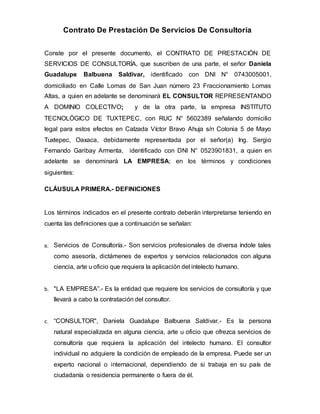 El documento es un contrato entre Daniela Guadalupe Balbuena Saldivar y el Instituto Tecnológico de Tuxtepec para que el consultor imparta un curso de capacitación al personal administrativo de la empresa. El consultor recibirá $75,000 pesos mexicanos por sus servicios, que serán pagados en dos partes. El contrato tendrá una duración de 54 días hábiles y detalla las obligaciones de ambas partes.