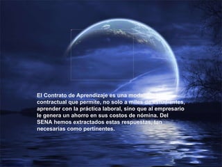 El documento habla sobre el contrato de aprendizaje, el cual permite a estudiantes aprender a través de la práctica laboral y genera ahorros de costos para las empresas. Explica que las empresas pueden cubrir su cuota de aprendices con alumnos del SENA, colegios asociados con el SENA, instituciones reconocidas por el SENA o estudiantes universitarios. También menciona que el POOL es una práctica de tres meses requerida por el SENA para que los aprendices obtengan experiencia relacionada a su form
