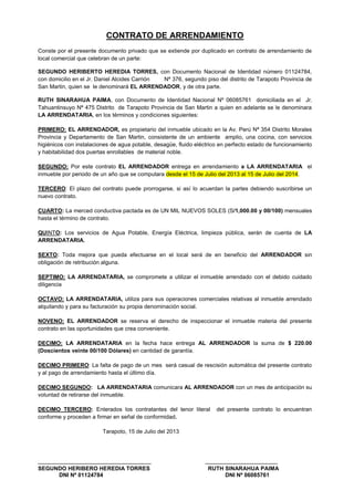 El documento es un contrato de arrendamiento de un local comercial celebrado entre Segundo Heriberto Heredia Torres como arrendador y Ruth Sinarahua Paima como arrendataria. El contrato estipula que el arrendador entrega el local ubicado en la Av. Perú Na 354 en Tarapoto por un año a partir del 15 de julio de 2013 hasta el 15 de julio de 2014 por un alquiler mensual de 1,000 nuevos soles. La arrendataria se compromete a usar el local con cuidado y pagar los servicios durante el arrend