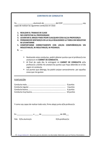 Los contratos de conducta son acuerdos escritos entre partes afectadas como padres e hijos o profesores y alumnos. Estos contratos establecen conductas específicas que el alumno debe seguir y las consecuencias de cumplirlas o no. Ofrecen claridad sobre las expectativas y responsabilidades de cada parte, e involucran al alumno en mejorar su comportamiento.