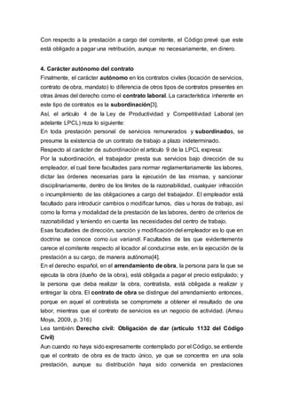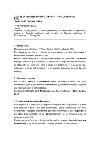 El documento define y explica el contrato de obra según el artículo 1771 del Código Civil. Señala que en este contrato el contratista se obliga a realizar una obra determinada y el comitente se obliga a pagar una retribución. Explica que la obra determinada implica obligaciones de hacer que terminan en dar algo como una construcción. También indica que el contratista actúa de forma autónoma a diferencia de una relación laboral donde hay subordinación. Finalmente, resume que el contrato de obra implica que el contratista se obliga a real