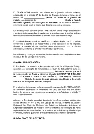 Este documento es un contrato eventual de trabajo entre un empleador y un trabajador. El contrato detalla el cargo, horario, remuneración, lugar de trabajo, obligaciones, legislación aplicable y plazo del contrato eventual de 180 días o menos. El trabajador acepta los términos del contrato para prestar sus servicios laborales al empleador por un período determinado.